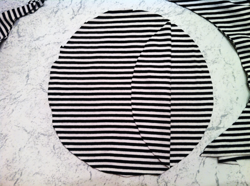 Use your plate as a guide to cut a circle out of the fabric. Leave the shirt intact so you can cut two pieces at one time.